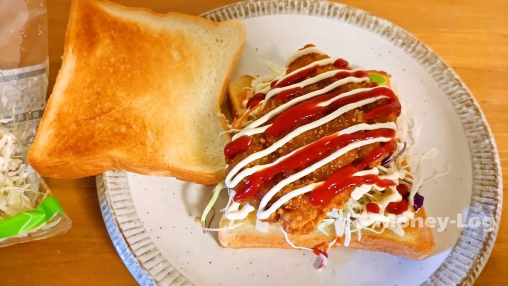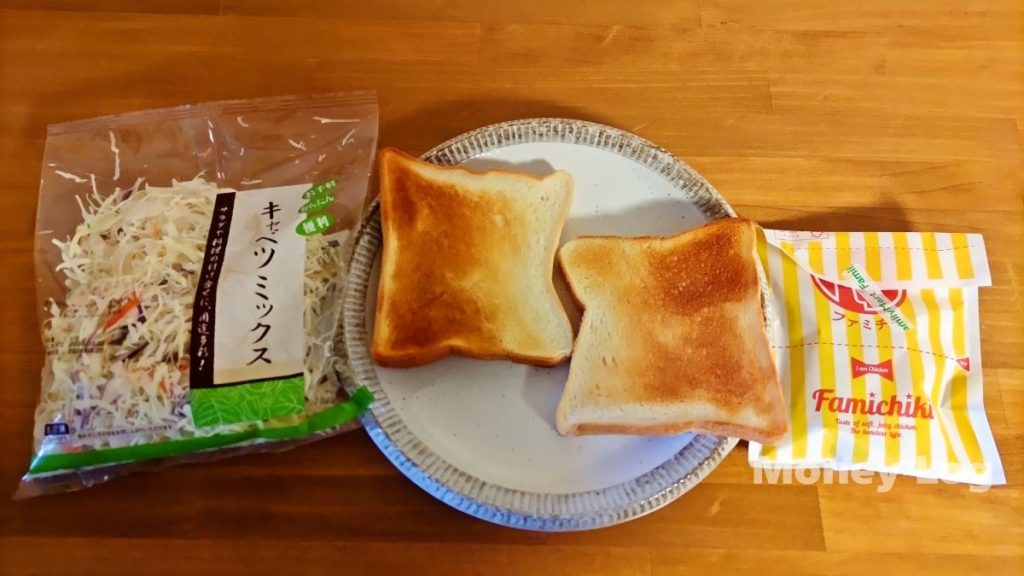 自作とはいえ、調理工程は最小限に。8枚切り食パン+カットキャベツ+ファミチキという、重ねるだけの簡単調理。