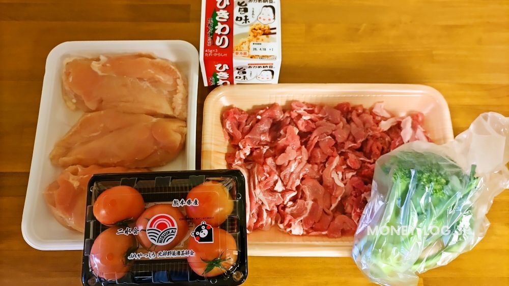 今日買ったのは、鶏むね肉大パック・豚こま切れ肉大パック・トマト・ブロッコリー・納豆の5品。シンプル。どれも普段の食事でよく使うド定番食材。大パック最高。