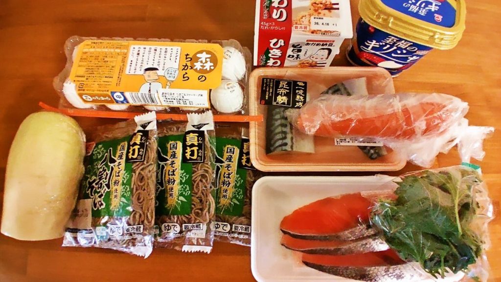今回は、たまご1パック、納豆1パック、ギリシャヨーグルト、大根半分、蕎麦3パック、塩鯖切り身2切れ、銀鮭甘塩切り身3切れ、にんじん1本、大葉お徳用1パック、の9品目を購入。