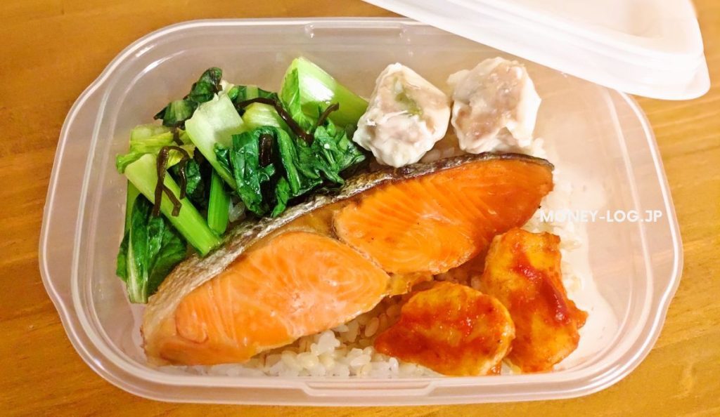 今日買ってきた鮭の切り身をメインに、残り物の小松菜とチルドシュウマイ、鶏むねを焼いてケチャップで味付けしたもの。小松菜は軽くレンチンして塩昆布で和えただけ。もち麦ごはんにおかずを載せるだけの「のっけ弁」スタイル。これに味噌汁かわかめスープなどの何らかの汁物を付けています。